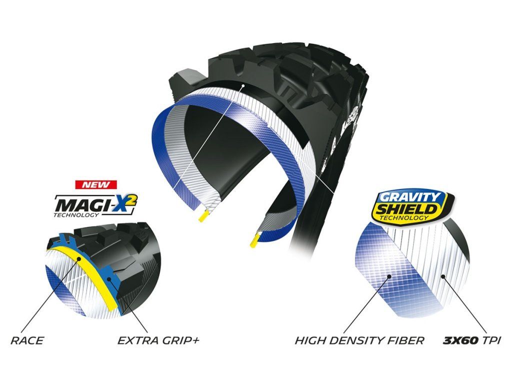* Gumová směs MAGI-X2 byla vyvinutá ve spolupráci s jezdci Enduro World Series, a díky ní má plášť nejlepší grip z kolekce plášťů Michelin.