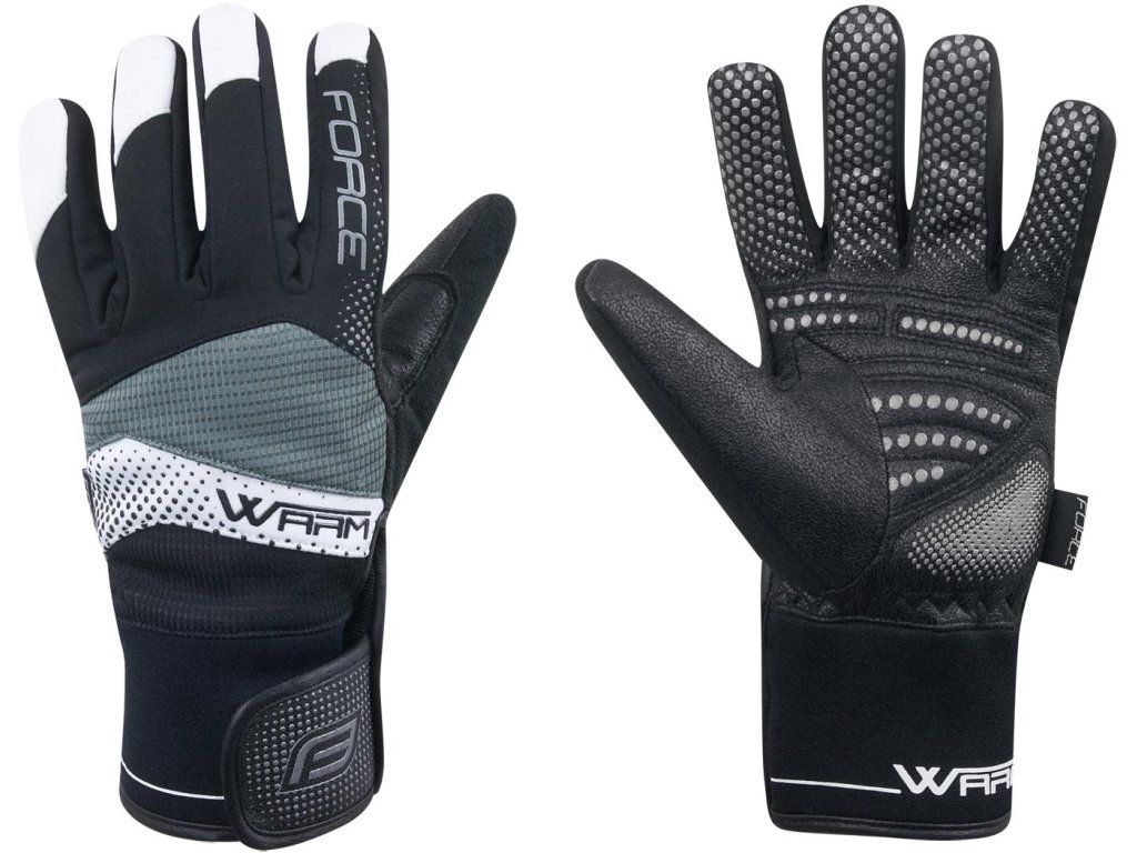 Zimní zateplené cyklistické rukavice Force Warm. Vhodné pro skutečně chladné počasí. Dlaň je s výstelkou a v oblasti úchopu je vyztužená koženkou. Vnitřní strana rukavice má protiskluzovou úpravu. Na zápěstí se zapínáním a extra prodlouženým elastickým lemem z neoprenu. Palec je ze savého froté pro snadné otírání potu.