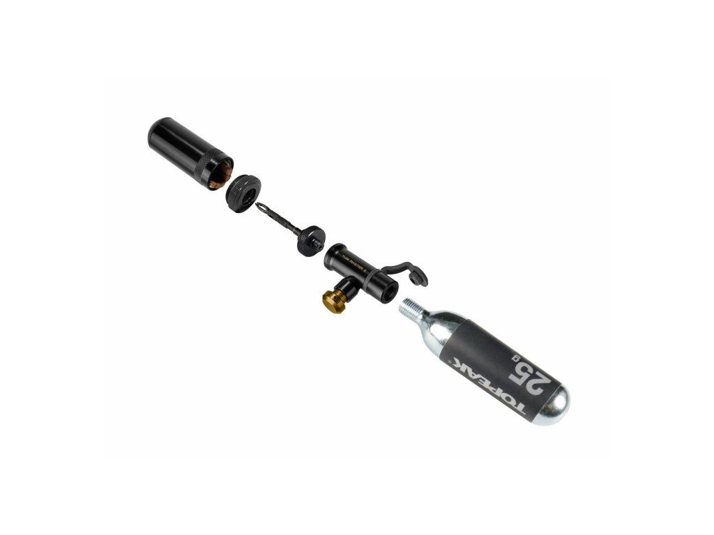 Sada na opravu a huštění bezdušových pneumatik mikro velikosti obsahující pokročilou hlavu vstřikovače CO2 2 v 1, která opraví defekt a nafoukne bezdušovou pneumatiku v jednom kroku masivním vzduchem nebo ji lze jednoduše použít jako tradiční hustilku CO2 přes dřík ventilu. Hlavice hustilky je kompatibilní s ventilky Presta i Schrader a přiložený montážní popruh se připevňuje k sedlovce nebo k rámu a může nést jednu nebo dvě 25g CO2 bombičky.